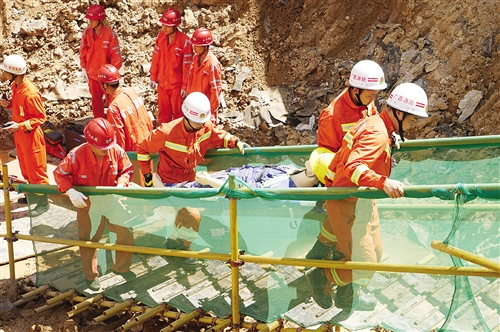 南宁市轨道交通3号线庆歌路站一个土建工地在深基坑开挖过程中,突然发生坍塌事故,造成5名施工作业人员被埋,市政供水管道、燃气管道被压破裂,自来水大量涌出,燃气大量泄漏,现场燃起大火。情况紧急!一场应急救援由此展开。昨日上午8时30分,一场没有预先通知的应急演练真正考验了南宁市各部门的应急能力。