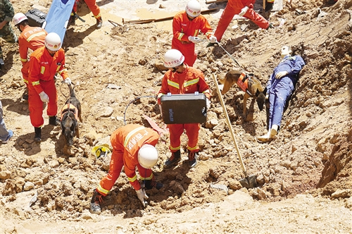 搜救犬出动,并使用生命探测仪找寻被埋工人